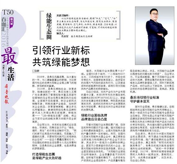 2016年,是桑樂擁抱社會(huì)、改革進(jìn)取、銳意創(chuàng)新的一年,桑樂當(dāng)家人王雪廣先生邀請(qǐng)到了管理經(jīng)驗(yàn)豐富且深諳市場(chǎng)營(yíng)銷的馬全軍出任桑樂集團(tuán)執(zhí)行總經(jīng)理,全面提升系統(tǒng)管理,樹立全新網(wǎng)點(diǎn)銷售形象;積極完善產(chǎn)業(yè)鏈條,加快研發(fā)企業(yè)新品;改革營(yíng)銷策略,建立多元化傳播理念;邀請(qǐng)倪萍擔(dān)任桑樂品牌形象代言人并提出桑樂新能源,綠能發(fā)展——“LE+綠能生態(tài)圈”戰(zhàn)略,將企業(yè)乃至行業(yè)的戰(zhàn)略發(fā)展方向提升至全新高度。