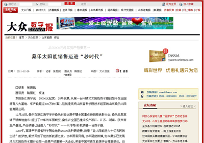 大眾日?qǐng)?bào):桑樂(lè)太陽(yáng)能銷售邁進(jìn)“秒時(shí)代”